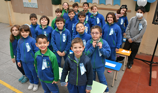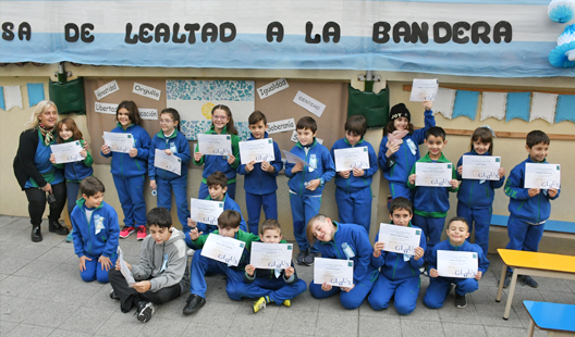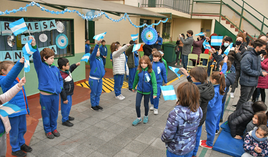 Y finalmente, llegó el día tan esperado… Aquel en el que, por fin, íbamos a decir “Sí, prometo”, pero sabiendo qué es lo que estábamos prometiendo y a qué nos estábamos comprometiendo. La escuela se vistió de celeste y blanco. Presentamos la bandera que realizamos en plástica con azulejos y cantamos, muy orgullosos, la canción “Quiero para mí”, del grupo Canticuénticos. Todo transcurrió en un clima muy especial: la Patria se hizo sentir a través de la Bandera. Así empieza a formarse en cada una y cada uno de ellos un sentimiento patriótico, emotivo para con un lugar que, desde pequeños, ya están aprendiendo a querer, a sentir, a cuidar, a conocer.
