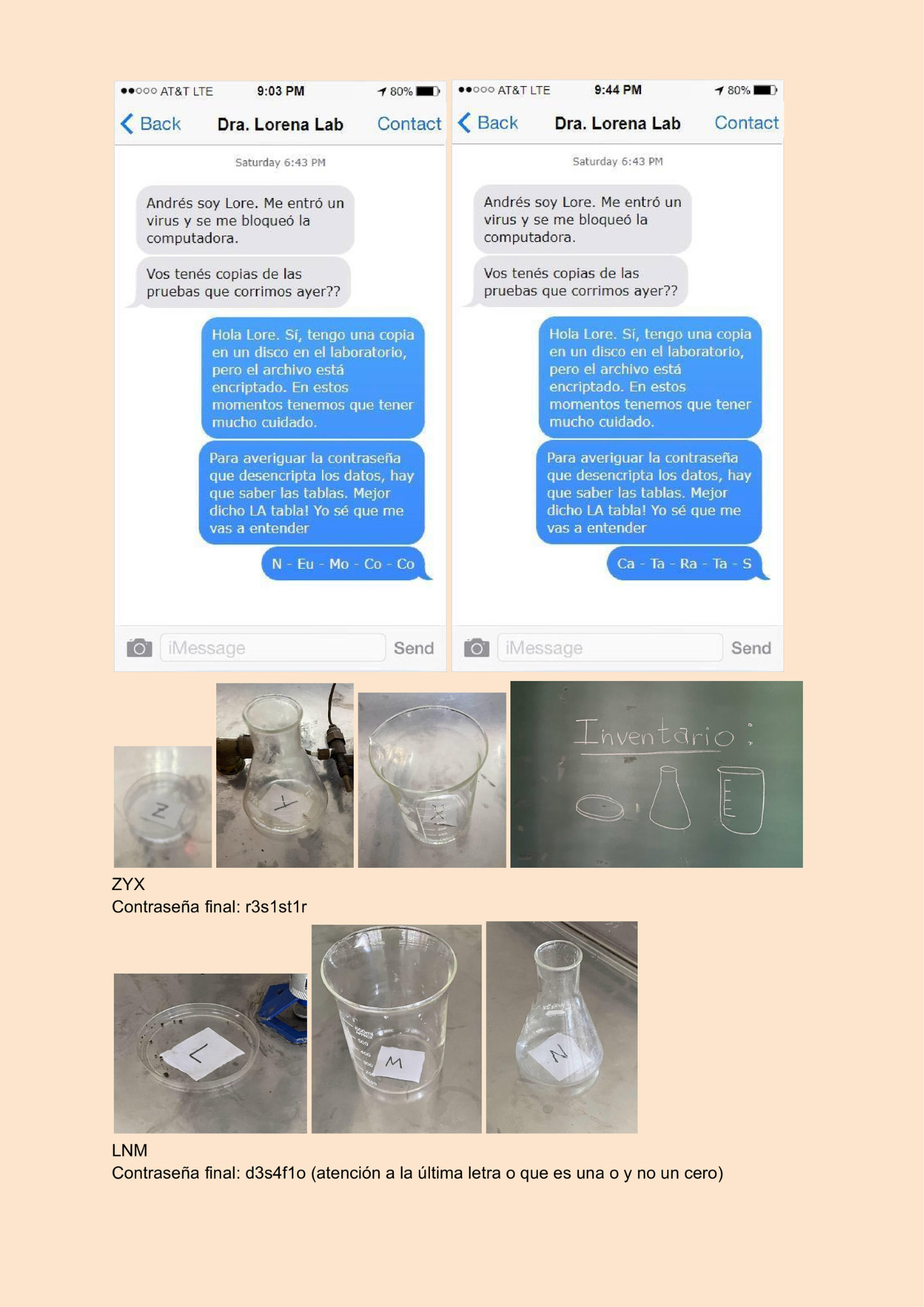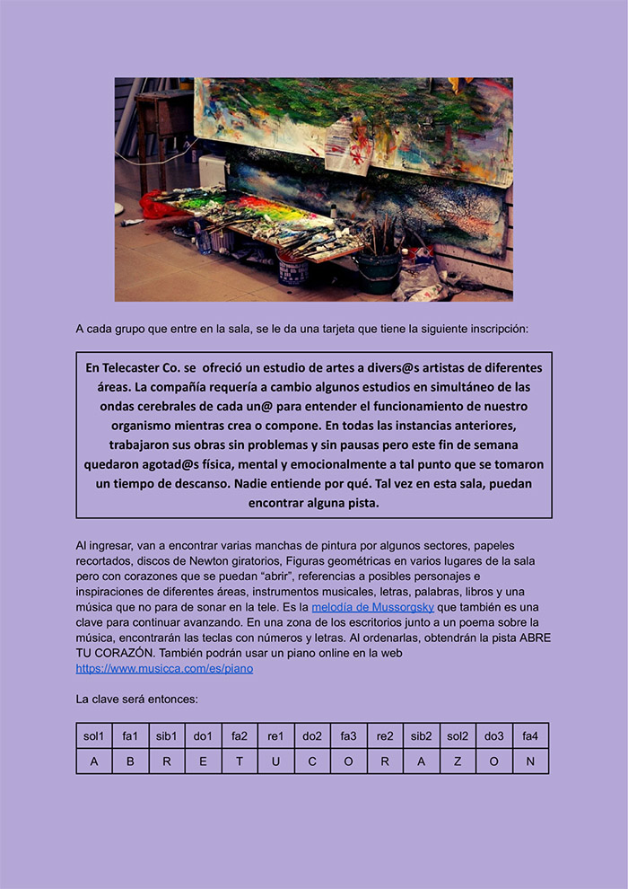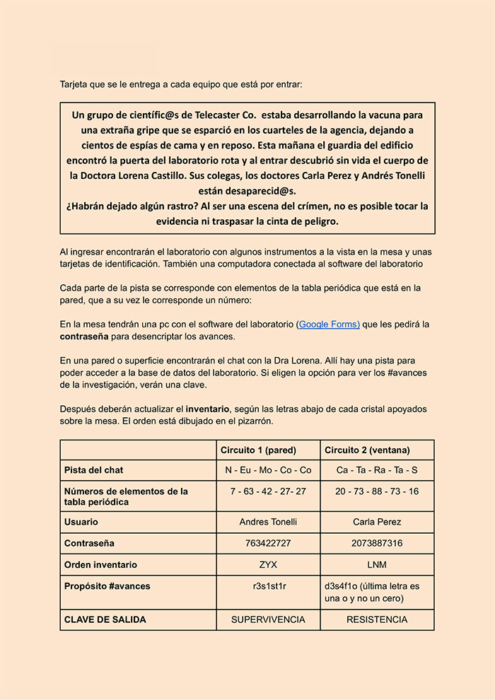 Se ambientaron dos aulas y el laboratorio bajo tres temáticas: análisis de la mente creativa (la sala de arte); el archivo digital (la oficina) y la escena del crímen (el laboratorio). Esta ambientación se realizó en tiempo récord antes del ingreso de las y los estudiantes: configuramos temporizadores, pegamos carteles, intervenimos las pizarras (e incluso el piso), preparamos tablets con los acertijos digitales, escondimos las pistas, distribuímos elementos decorativos, ambientamos sonoramente el espacio de arte y dividimos cada lugar en dos partes espejadas para optimizar el tiempo.
